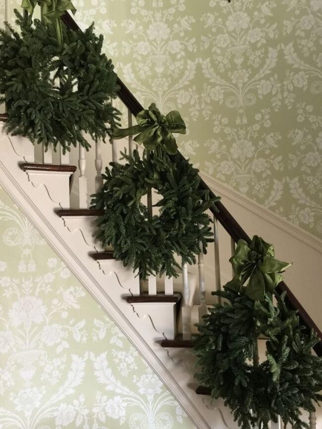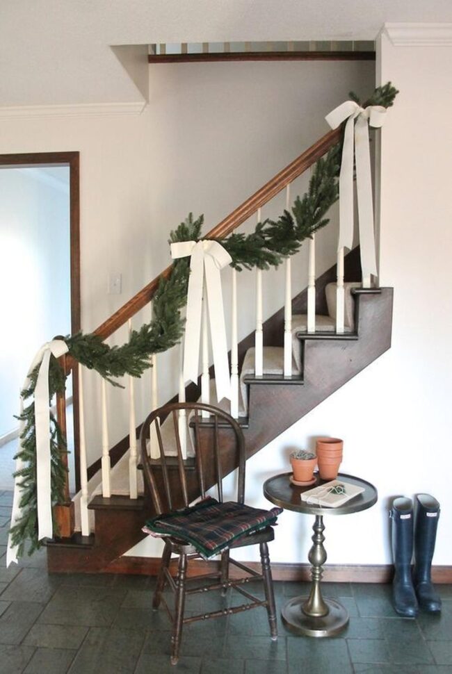 Wooden stairs adorned with fresh green garland and pristine white ribbons create an enchanting pathway into intimate spaces.