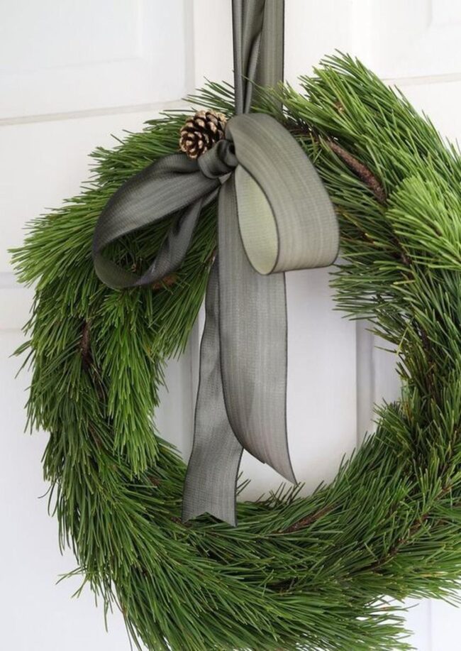 Crisp gray ribbon wraps around the circular design, offering stunning contrast against rich evergreen branches.
