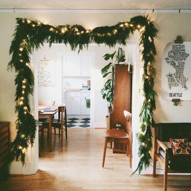 Wooden floors anchor rooms with natural warmth, while green garlands with soft lights modernize doorways into magical entrances.
