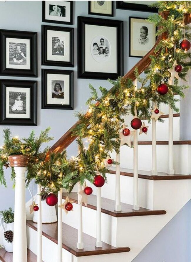 Lush green garlands dancing along staircase railings introduce natural beauty, softening the clean architectural lines with organic touches.