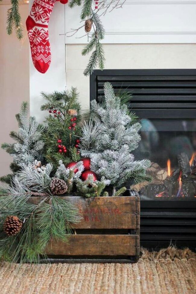 Wooden crates overflowing with pine branches and frosted pinecones create an inviting woodland atmosphere that whispers winter stories.