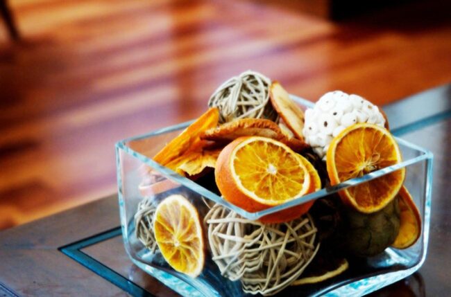 Dried orange slices nestled alongside woven balls inside a clear glass bowl can instantly elevate your living space with organic charm.