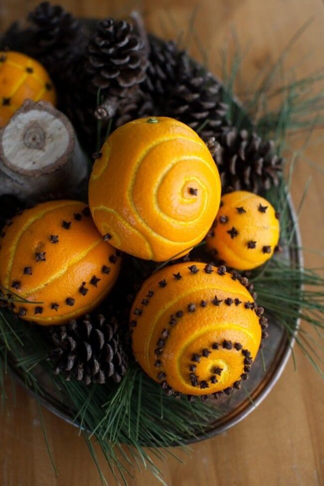 Dark cloves nestled into bright oranges create a stunning focal point, seamlessly blending with scattered pine cones and fresh pine branches.