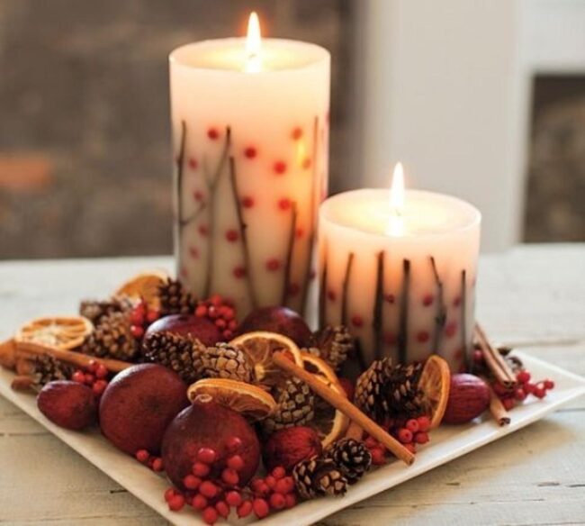 Nearby candles cast a magical glow, illuminating the intricate textures of smooth citrus and rough pine.