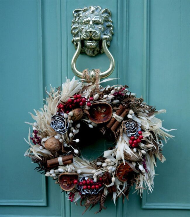 Welcoming guests starts with a stunning door that tells a story through carefully chosen decorations, like a wreath bursting with nature's palette of browns, reds, and whites.