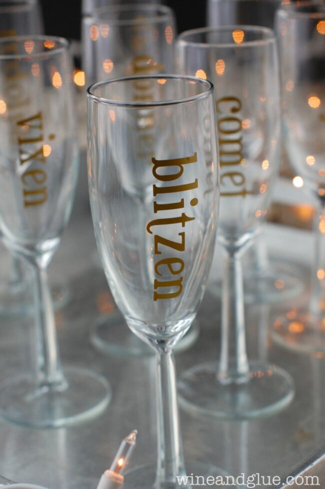 Delicate gold lettering dances across smooth glass surfaces, adorning each flute with reindeer names in crisp, modern typography.