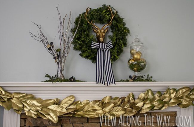 Sparkling gold leaves cascade across the mantel, catching light and drawing wandering eyes.