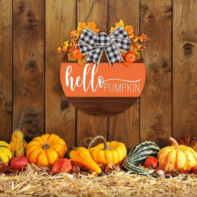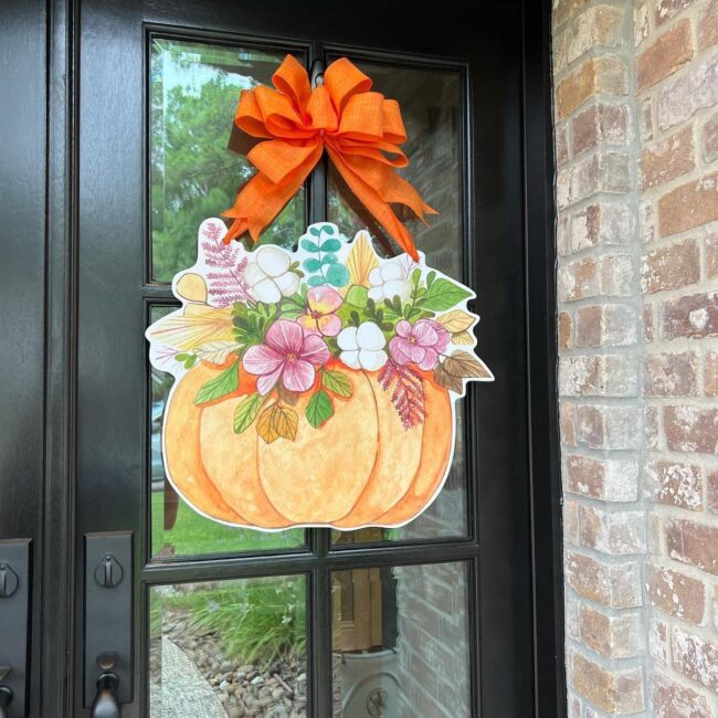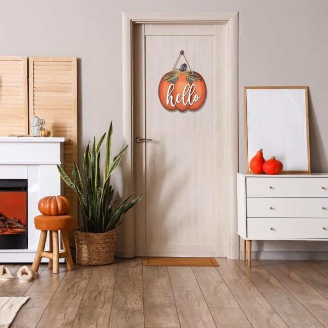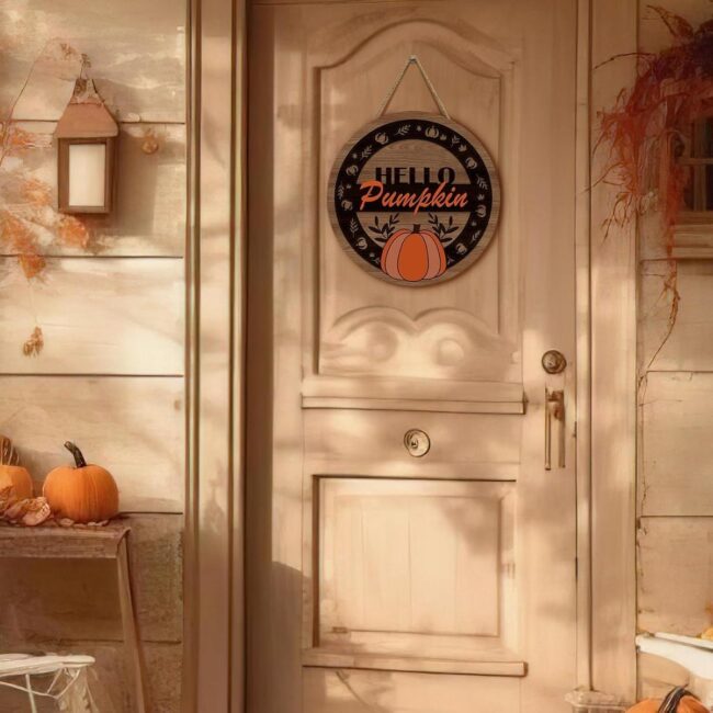 Your front door becomes an autumn welcome mat with a charming pumpkin-themed hanger that whispers seasonal magic.