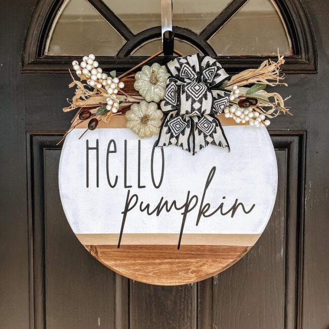 Your front door becomes a canvas of autumn magic with a charming wooden pumpkin sporting a whimsical black-and-white checkered bow that instantly catches eyes.