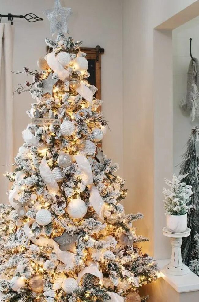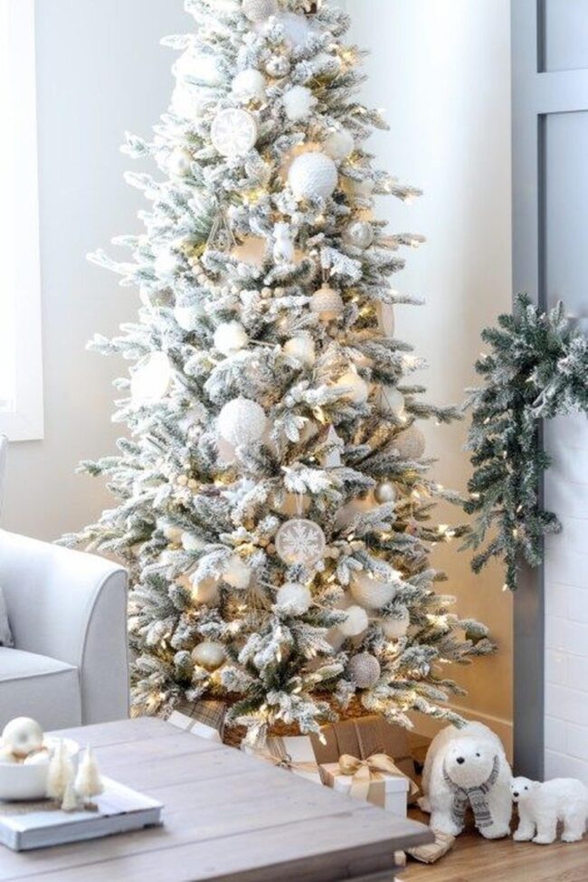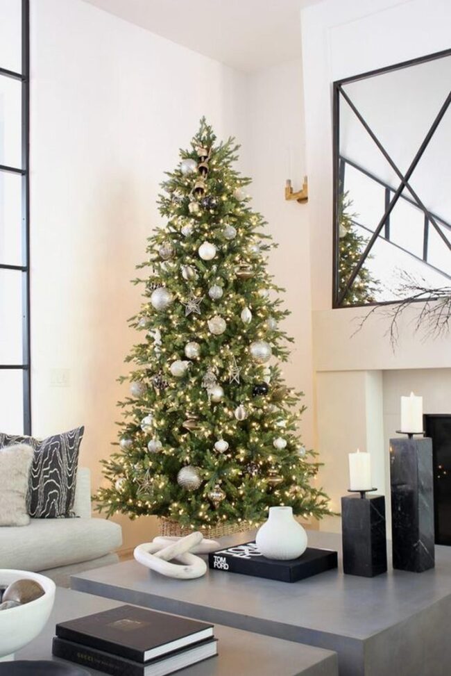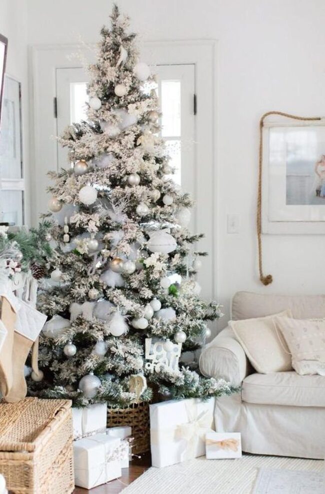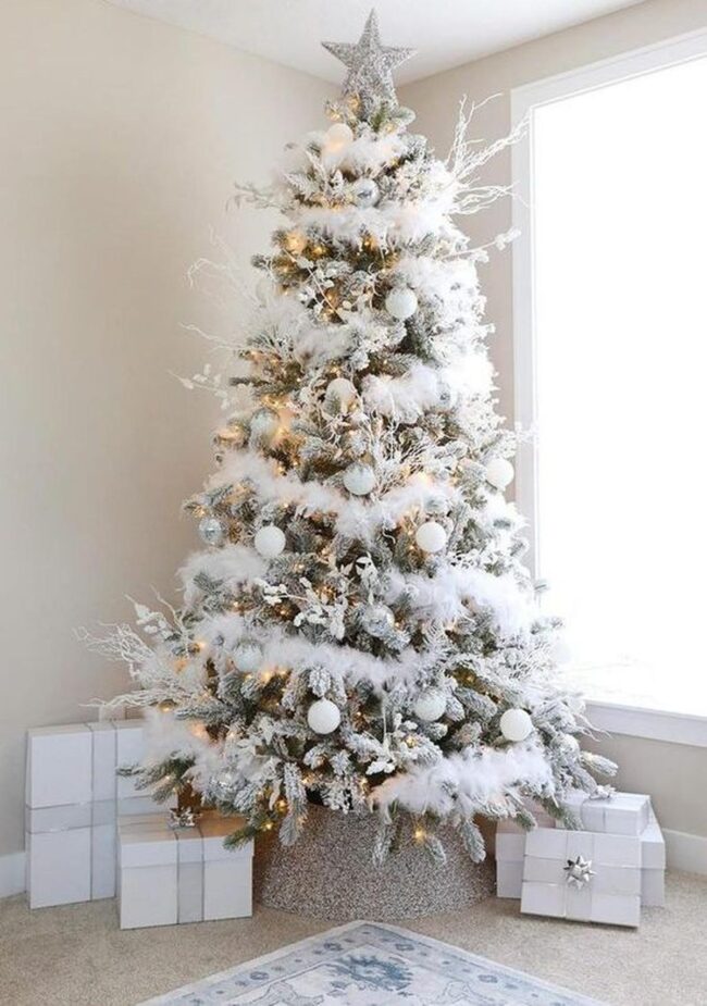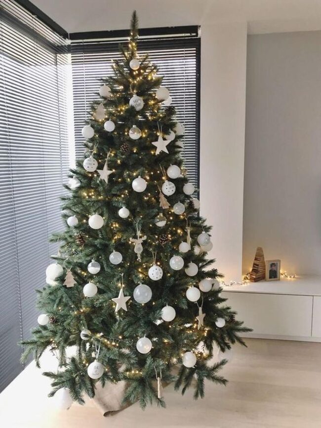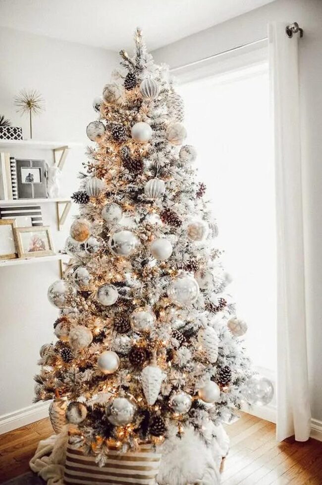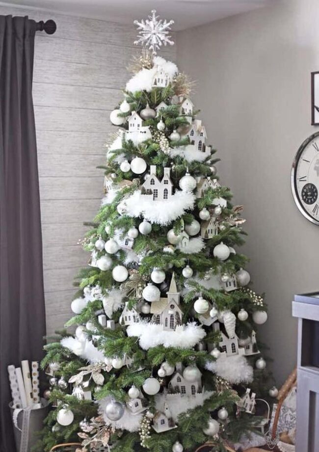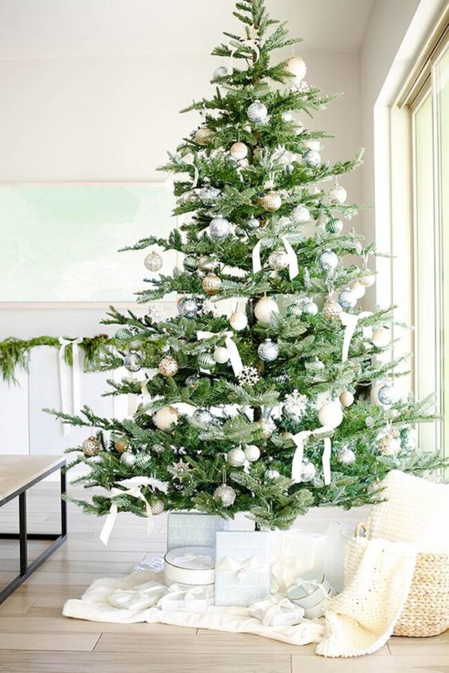 Delicate silver and white ornaments dance on the Christmas tree, sparkling with enchantment and drawing your gaze across the tranquical room.