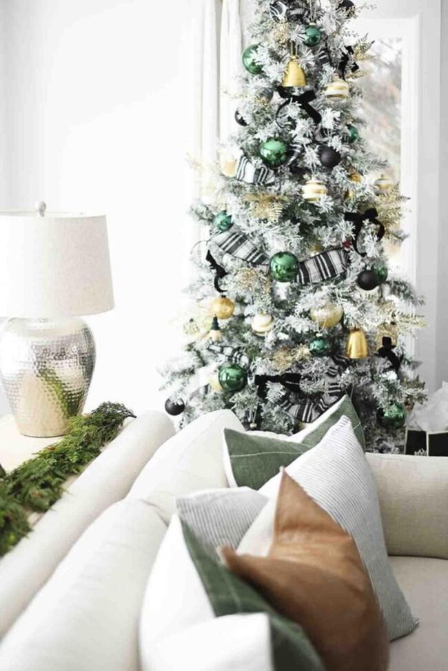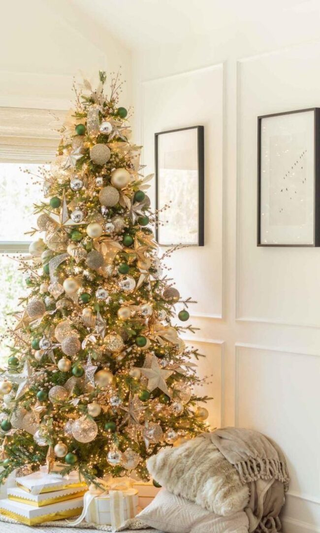 White and gold ornaments dance across evergreen branches, casting magical winter vibes that instantly draw your eye and heart.