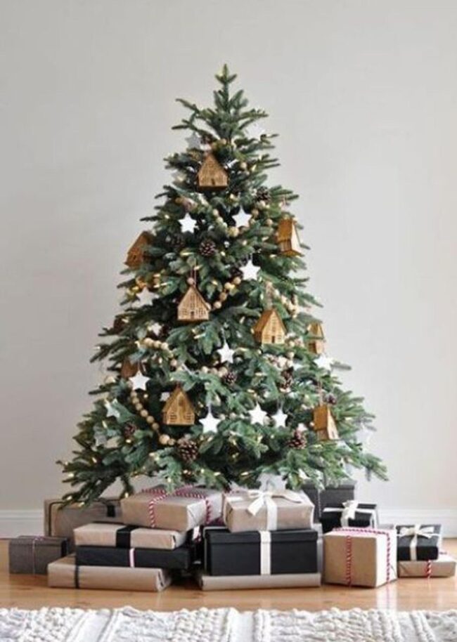 Carefully wrapped black-and-white packages nestle softly beneath the tree, adding unexpected graphic charm to the scene.