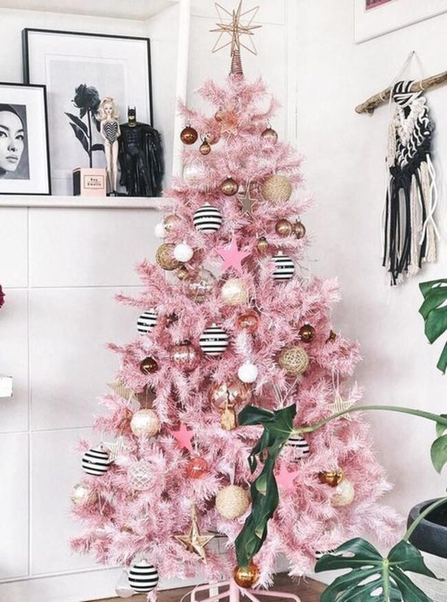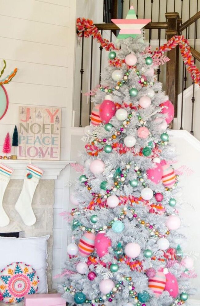Soft pink, emerald green, and quirky striped ornaments cascade across fluffy branches, creating a delightful visual wonderland that breaks traditional holiday decorating rules.