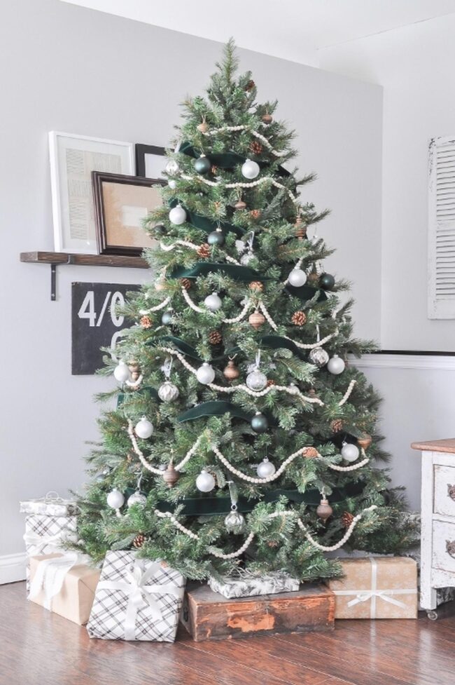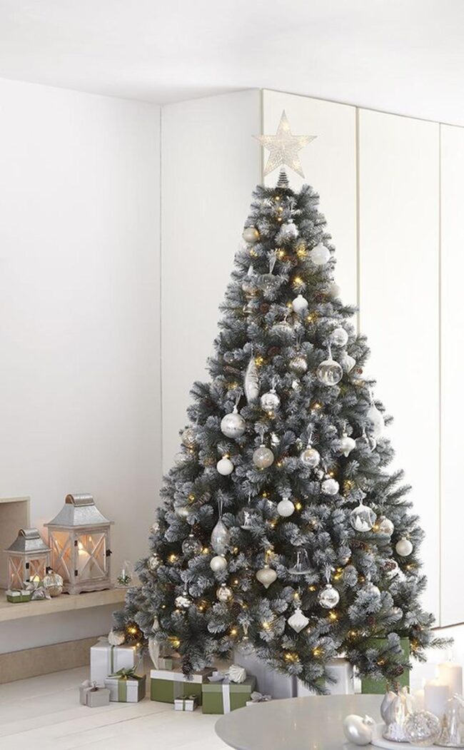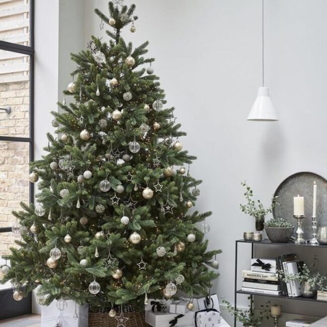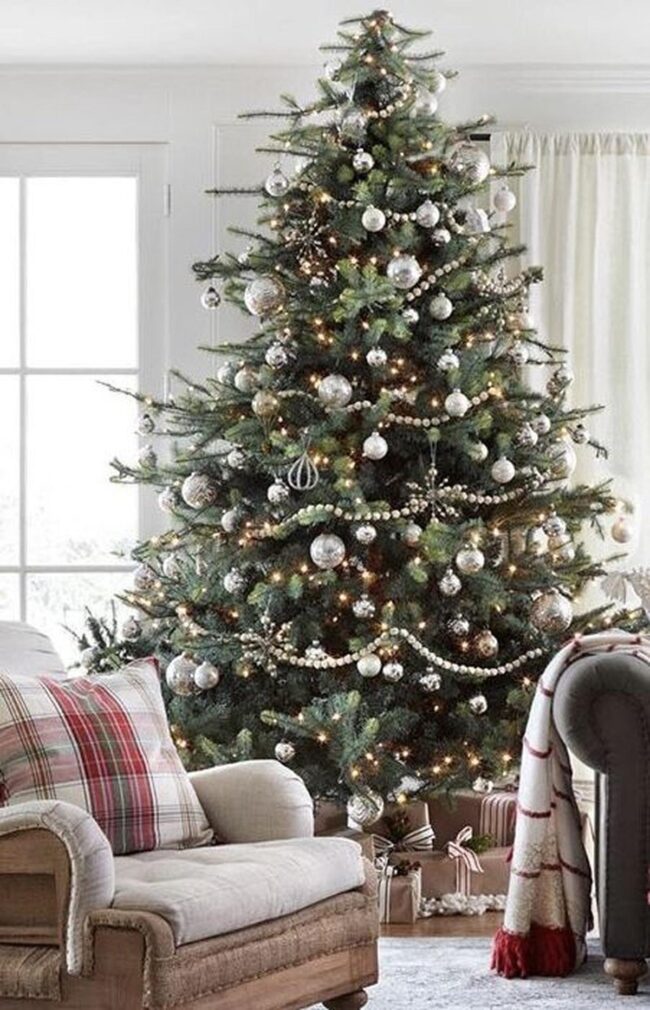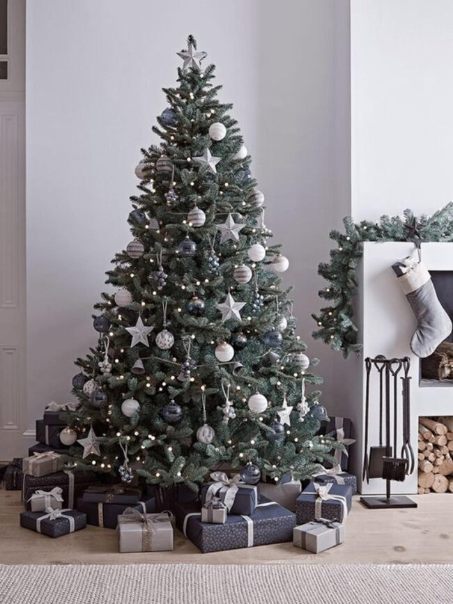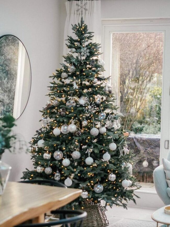Silver and white ornaments sparkle magnificently against lush green branches, weaving an enchanting holiday landscape inside your home.