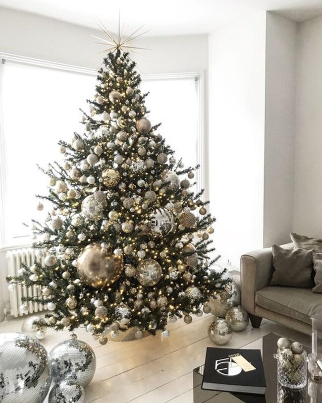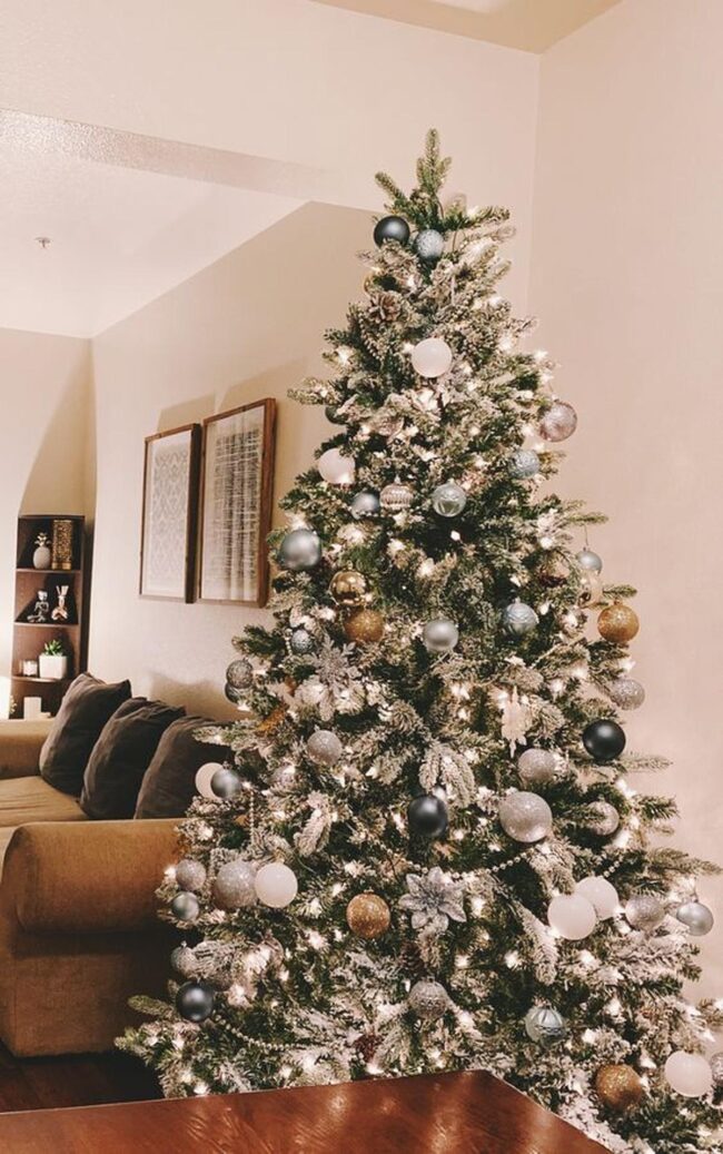White lights dance across an elegant Christmas tree, adorned with shimmering silver, gold, and black ornaments that catch every eye.