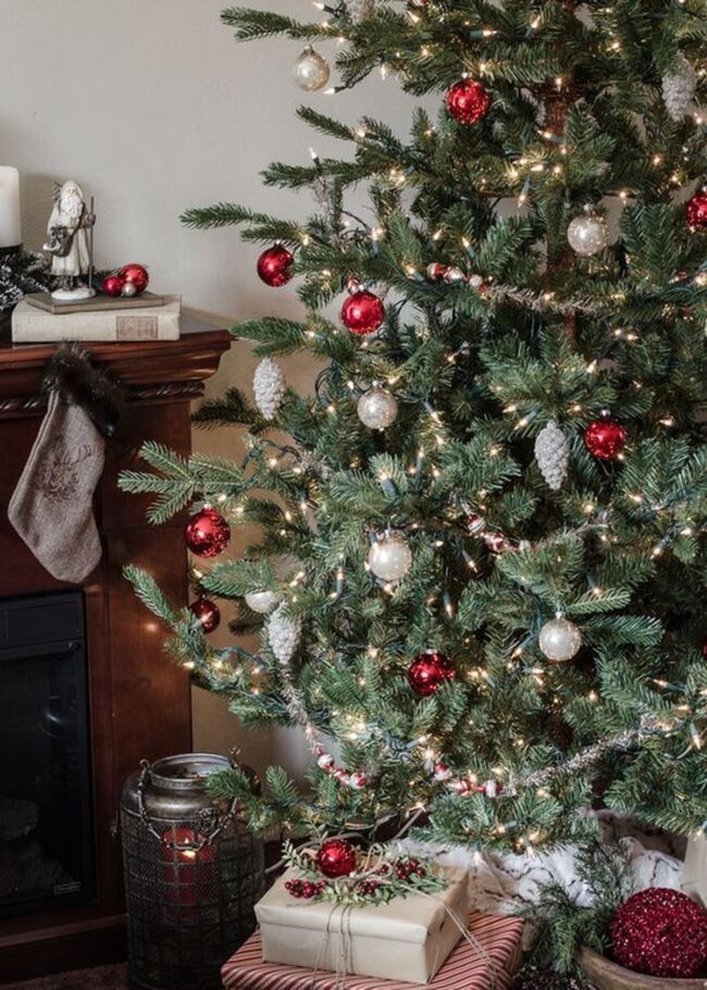 Sparkling ornaments in classic red and white cascade beautifully across evergreen branches, creating a visual symphony that draws every gaze.