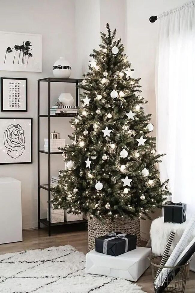 Decorative stars sprinkle whimsical touches throughout the tree's contemporary silhouette, inviting wonder and delight.