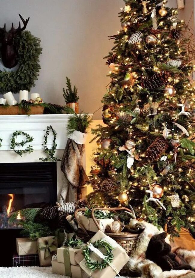 Scattered pinecones add gentle woodland charm while twinkling lights weave enchantment through evergreen branches.