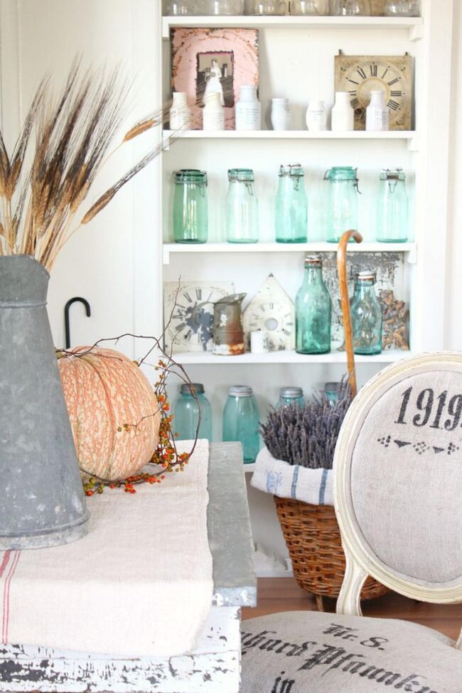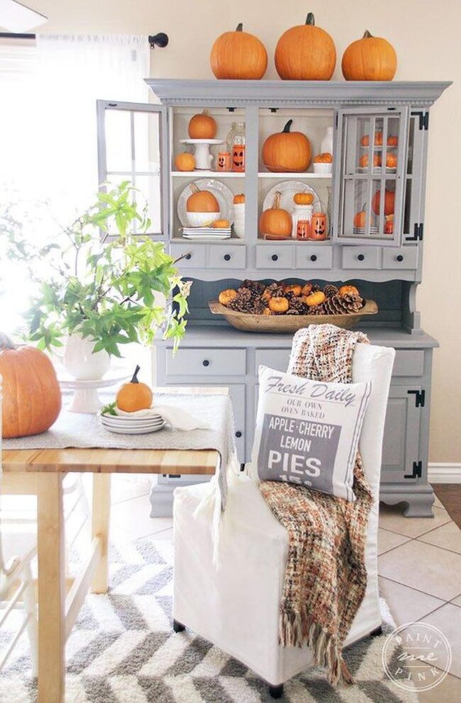Cheerful pumpkins nestled beside vintage cabinets bring soft autumn vibes without overwhelming the room's delicate balance.