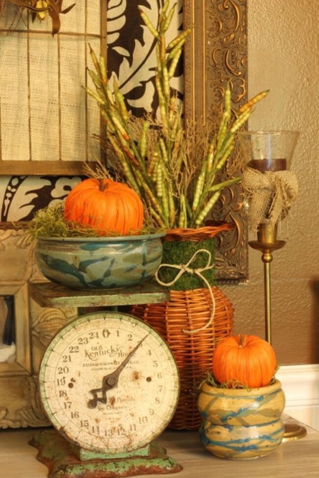 Vintage charm meets modern freshness in this delightful corner where an antique scale whispers stories of bygone days while bright orange pumpkins nestle playfully against cool blue-green pottery.