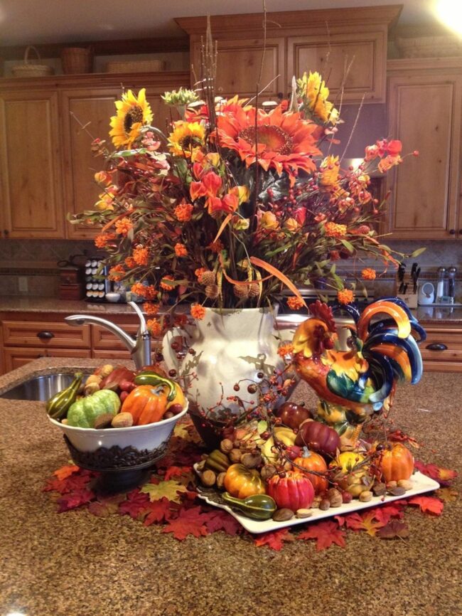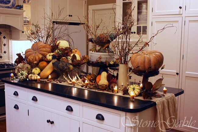 Fall colors burst from the kitchen island, with pumpkins in orange, yellow, and green creating a stunning harvest display against crisp white cabinets and rich dark countertops.