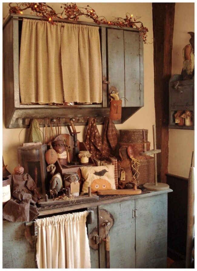 Soft blue corner cabinets whisper stories of cherished memories, surrounded by charming cloth dolls and vintage treasures that instantly transport you to a peaceful countryside retreat.