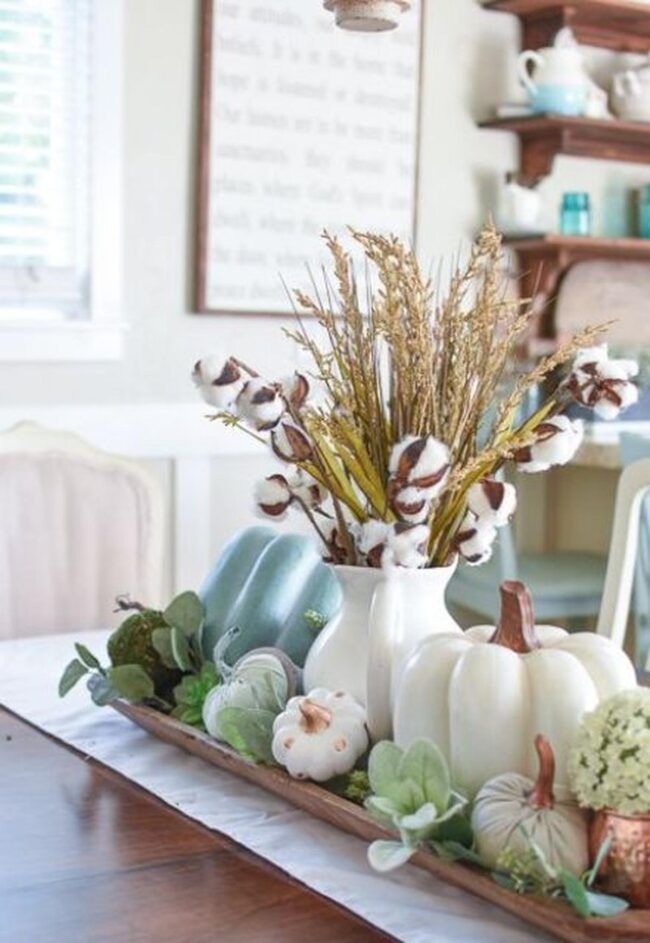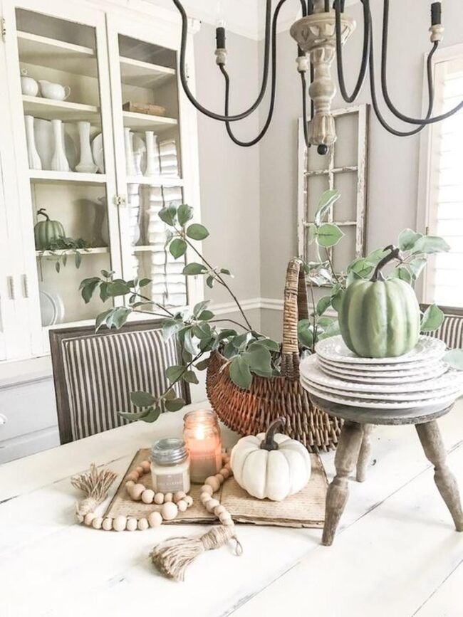 Fall whispers softly through your dining space with charming white pumpkins nestled beside delicate green gourds, creating an effortless seasonal welcome.