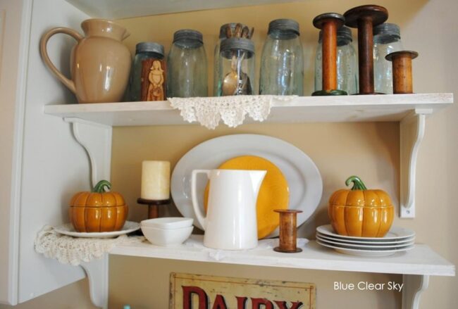 Pumpkin magic sprinkles joy across kitchen spaces where wooden shelves showcase charming ceramic containers and delightful autumn accents.