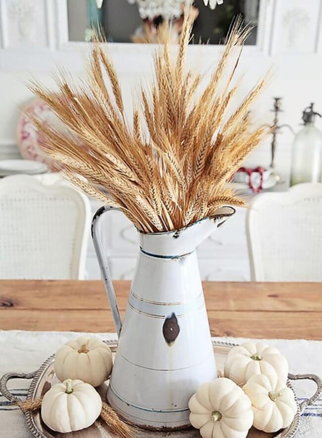 Golden wheat stalks nestled inside a tall white metal pitcher become a charming focal point that instantly draws your eye and warms your heart.