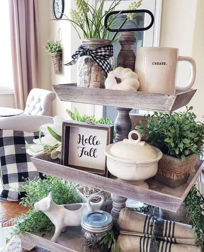 Wooden trays become magical autumn stages where white pumpkins and ceramic mugs dance together, inviting seasonal charm into your living space.