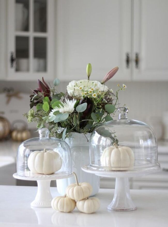 Fall whispers through your kitchen with an enchanting display of white and dark green pumpkins nestled gracefully on a speckled countertop.