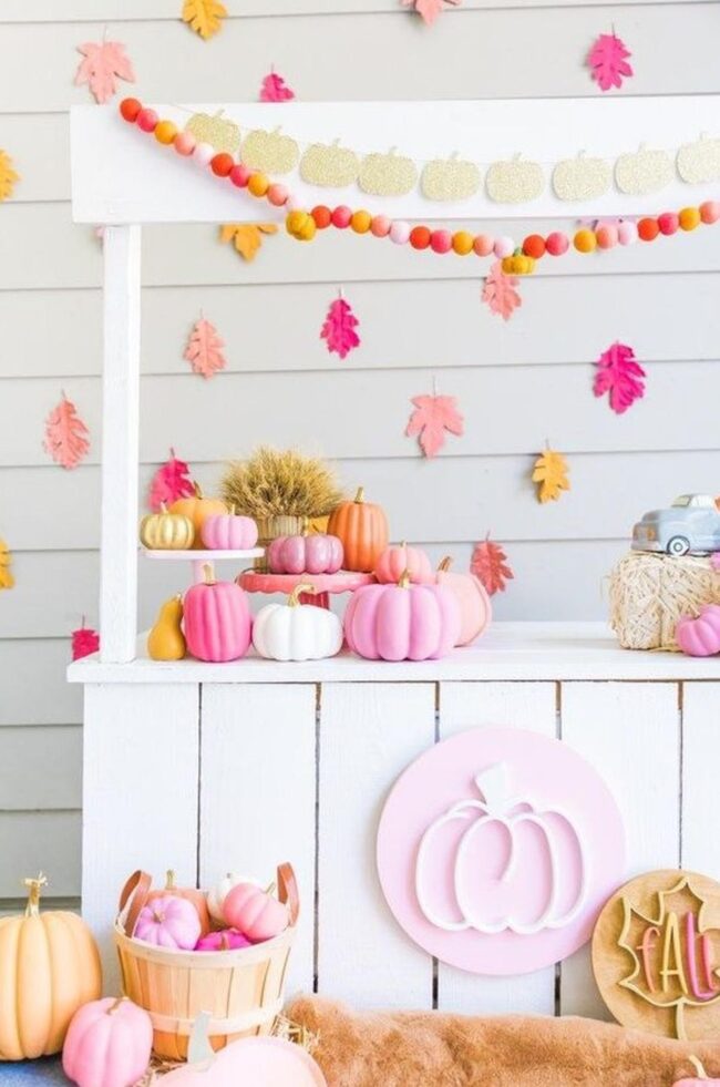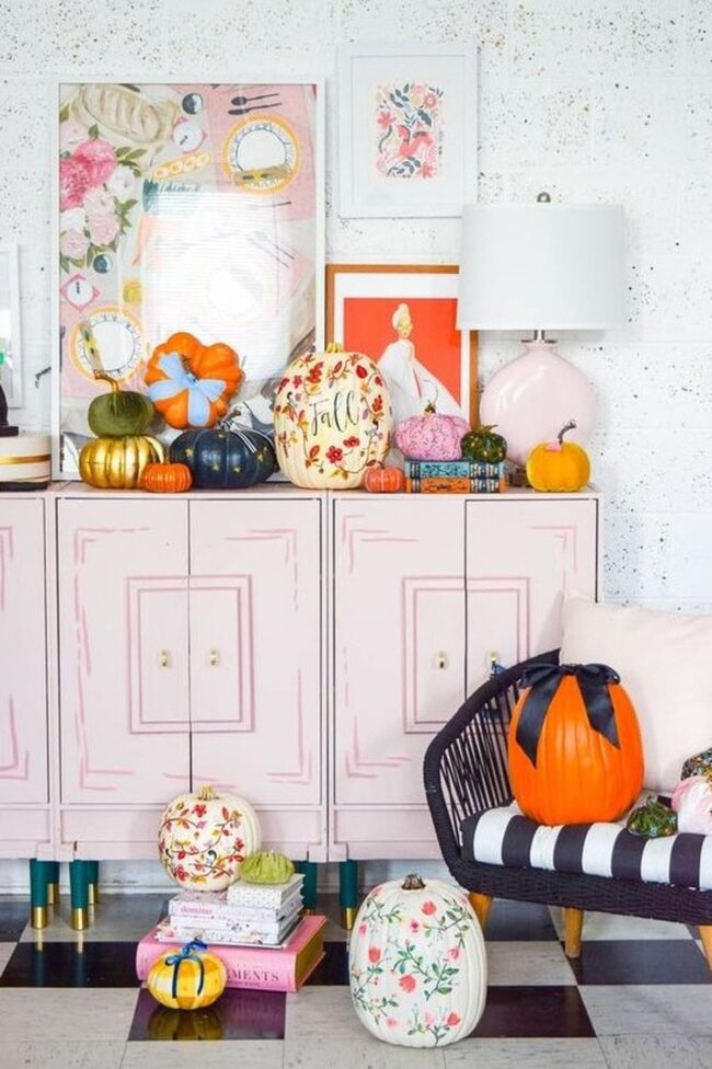 Pink cabinets serve as a stunning canvas for seasonal decor, where playful pumpkins in different sizes and shapes dance across the surface.