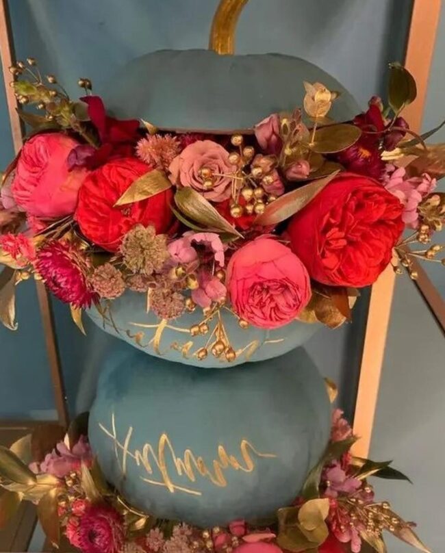 Fall decorations burst with unexpected charm when blue pumpkins meet delicate gold script, rebuilding ordinary surfaces into eye-catching displays.
