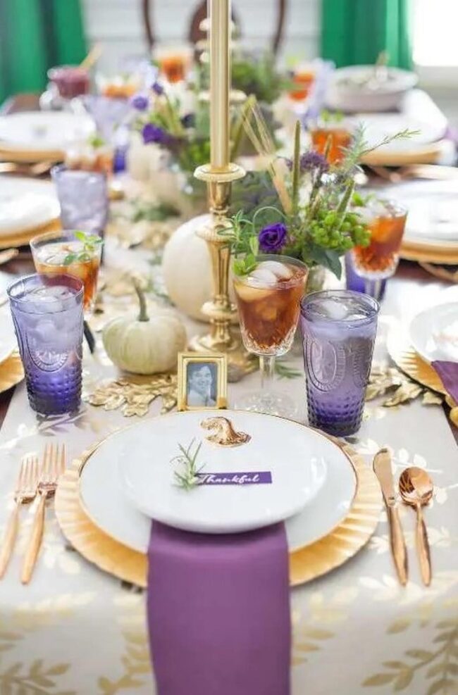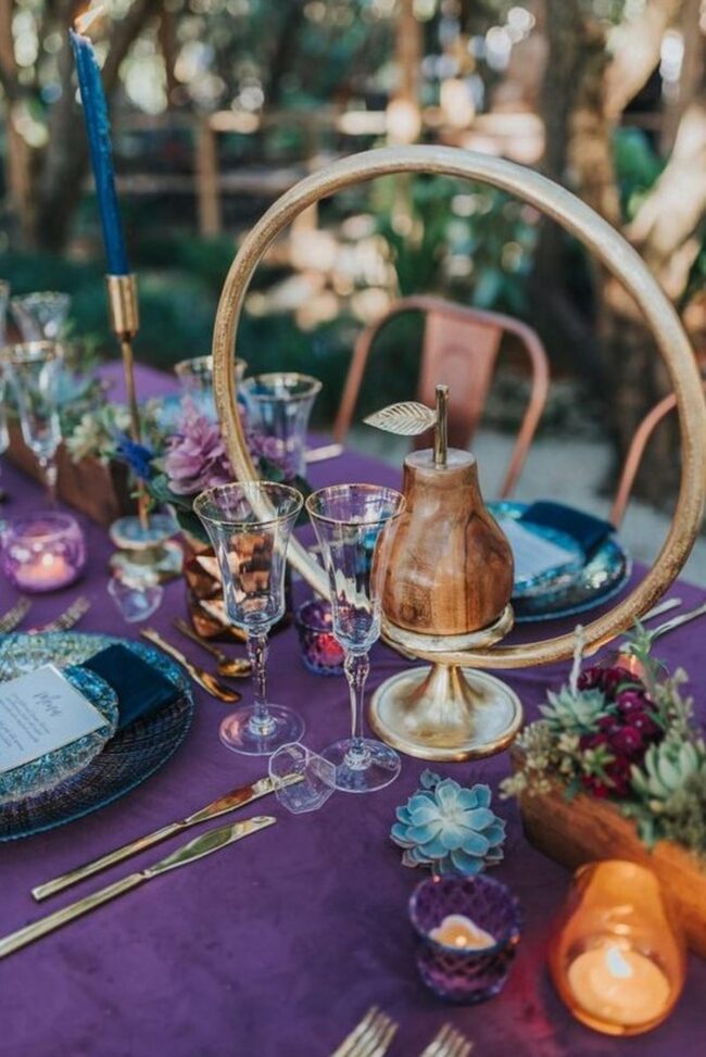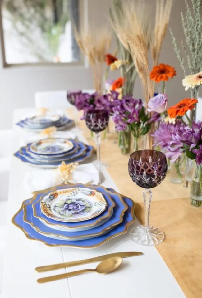 Stunning blue and gold plates dance alongside regal purple goblets, instantly drawing eyes across a table that whispers sophistication.