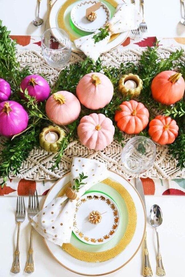 Pumpkins painted in dreamy pink, tangerine, and lavender shades burst with unexpected charm across a carefully curated table setting that instantly sparks conversation.