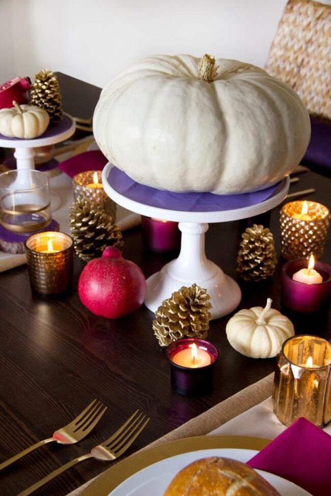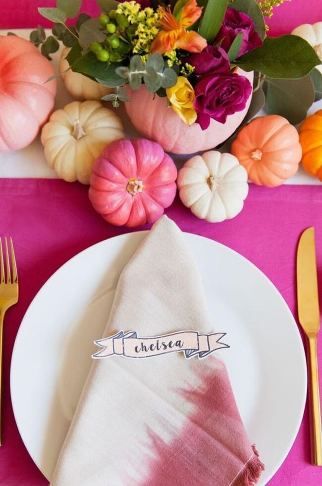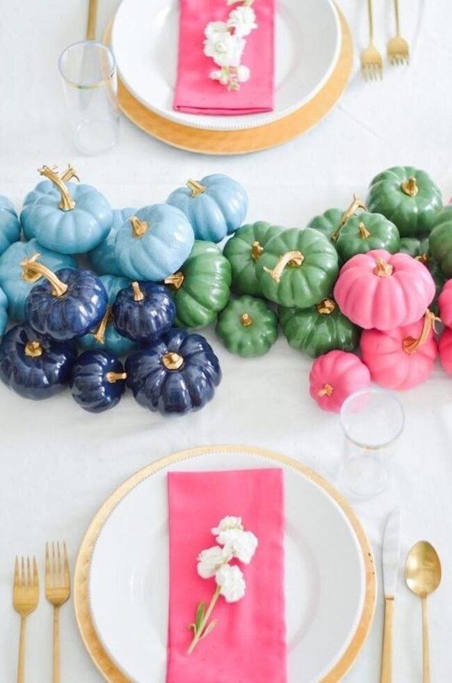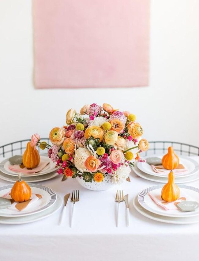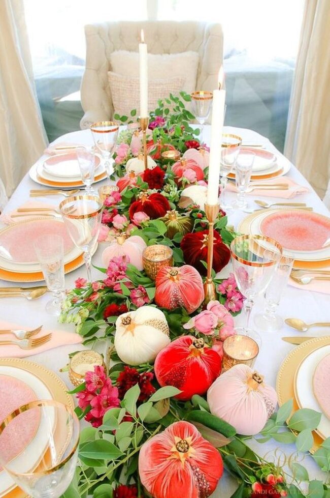 Pumpkins in soft pink, white, and orange evolve your dining space into an autumn wonderland, spreading delightful seasonal magic across your table.