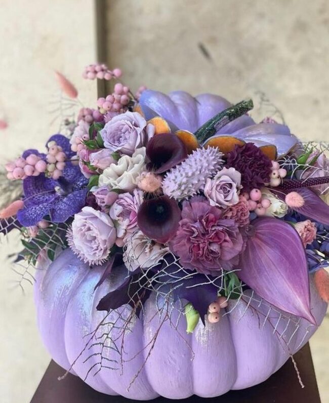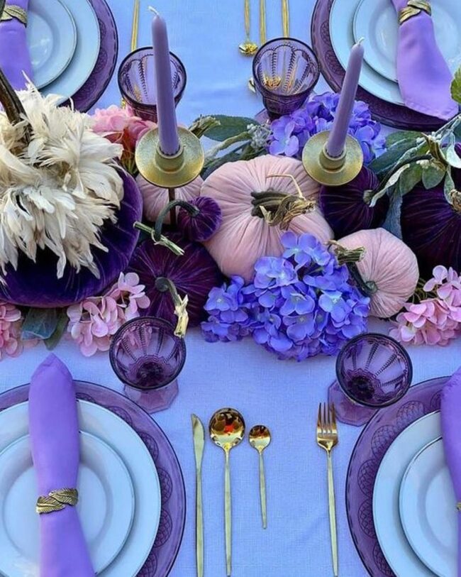 Purple pumpkins nestled among blue flowers create a magical centerpiece guaranteed to spark conversations.