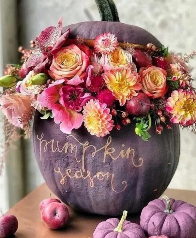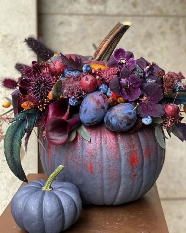 Pumpkins painted in sophisticated gray become unexpected canvases for artistic expression, where deep purple blossoms and crimson accents dance across their surfaces.