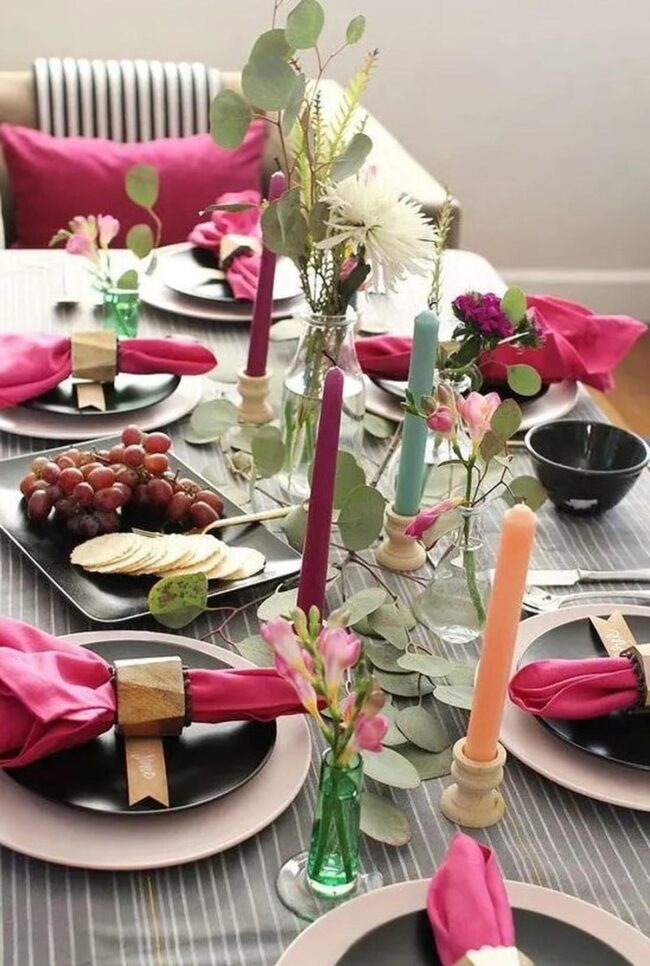 Decorating your dining space becomes an exciting adventure with soft pink napkins dancing against sleek black plates, creating stunning visual drama that catches everyone's eye.