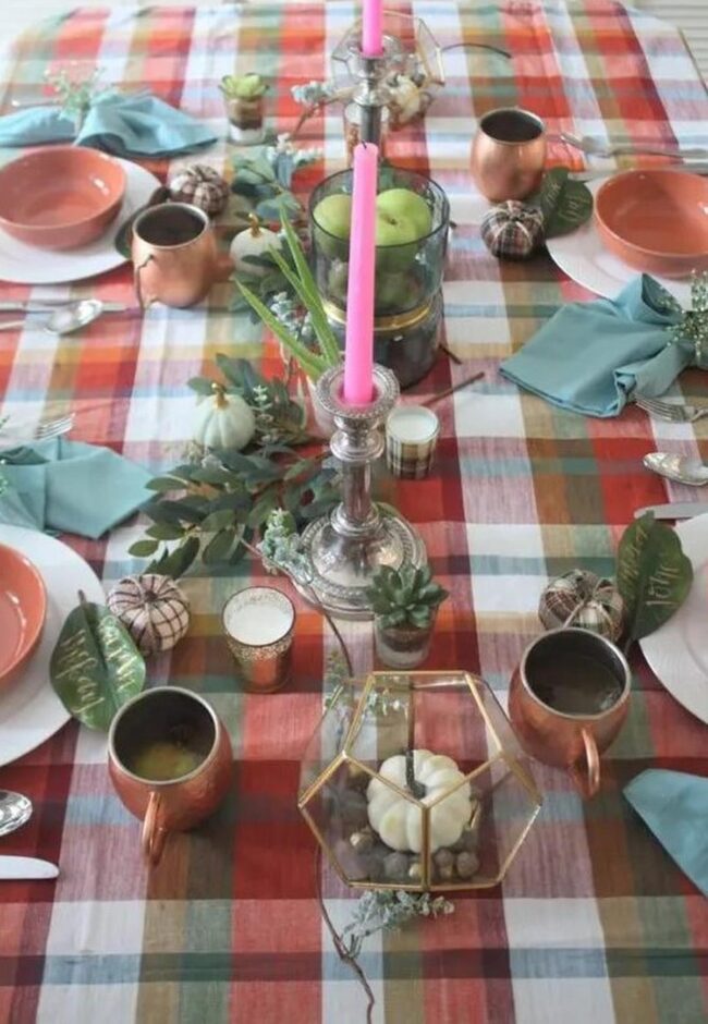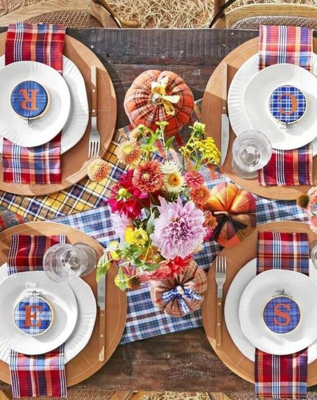 Color bursts from plaid patterns dancing across a welcoming table, instantly drawing your eye with red, blue, and yellow energetic vibes.