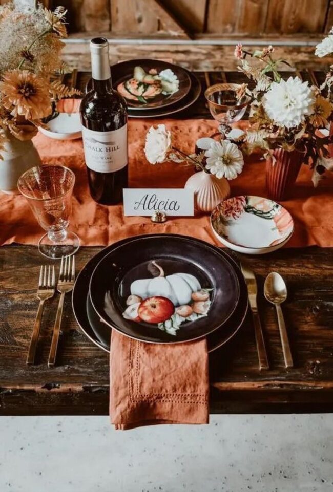 Tiny pumpkins scattered casually around the table add seasonal whimsy without feeling overly planned.