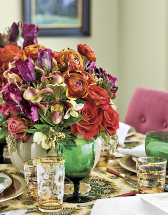 Flower arrangements bursting with crimson, tangerine, and plum shades instantly convert your dining space into a welcoming sanctuary that catches every eye.