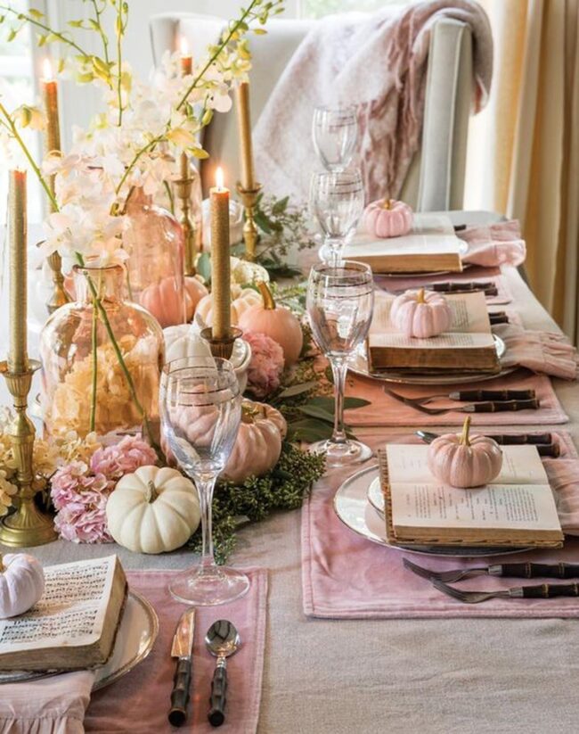 Small matching pumpkins cascade down table centers, highlighting carefully curated place settings with understated charm.
