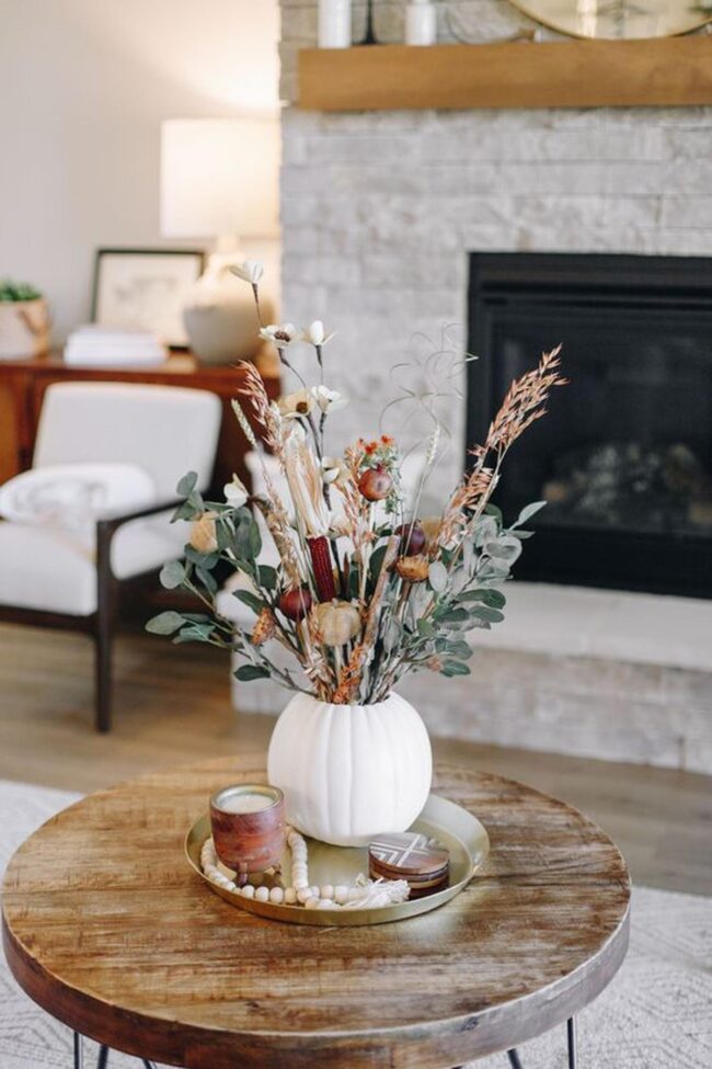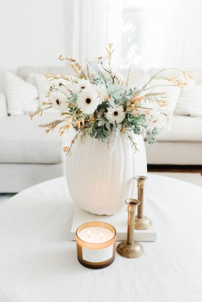 Soft white pumpkin vases cradle delicate blooms, bringing nature's gentle touch indoors where comfort meets style effortlessly.