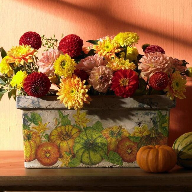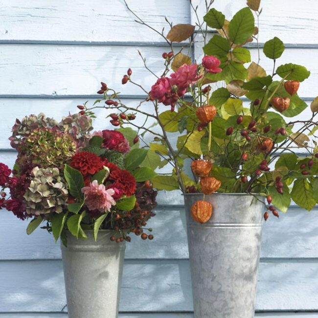 Chrysanthemums, sunflowers, and roses in rich burgundy, gold, and orange tones pair beautifully with rustic elements like wooden containers or copper accents.