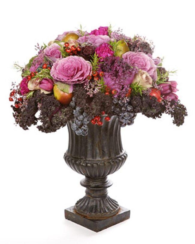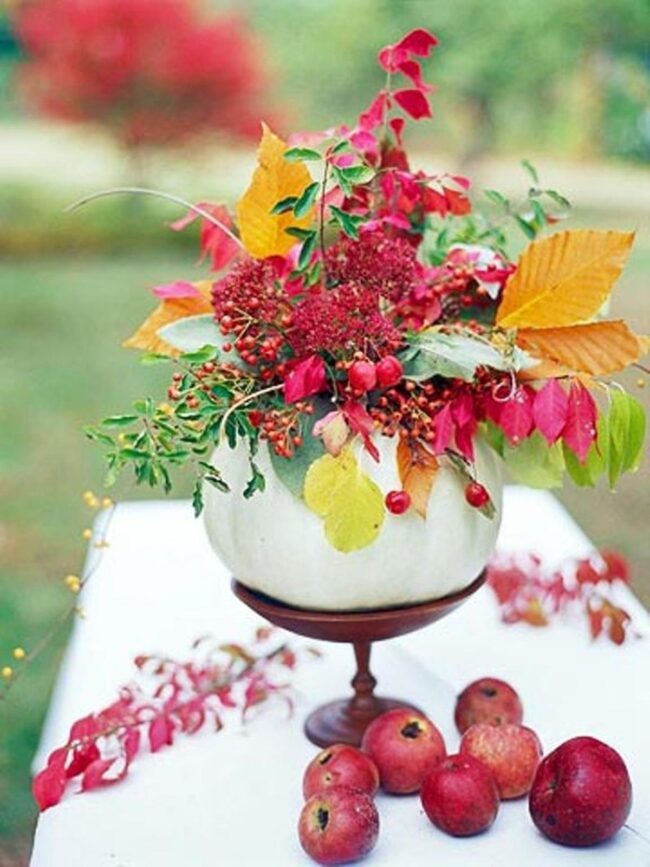 White pumpkins become gorgeous vessels for cascading berries and leaves in rich jewel tones of crimson, emerald, and golden yellow.