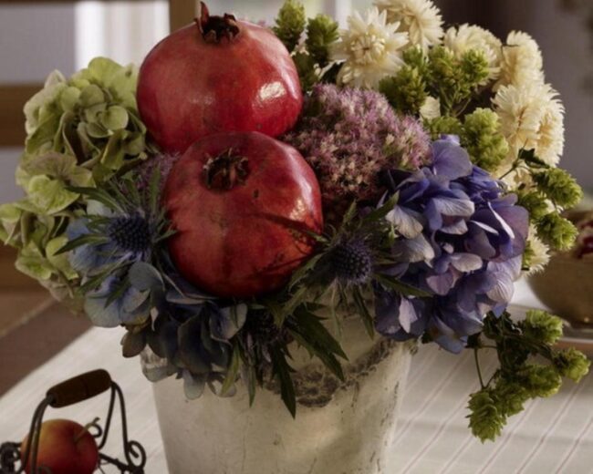 Bursting with personality, color-rich pomegranates nestled among blue, purple, green, and cream flowers create a magical scene that instantly brightens your living space.