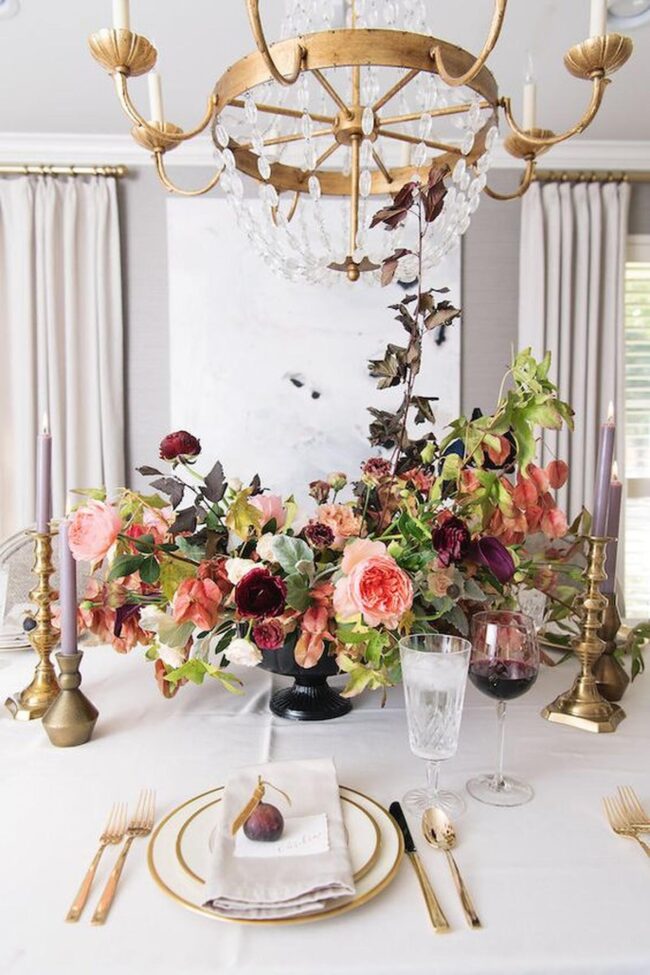 Gleaming gold candleholders peek out behind the floral display, promising enchanting evening moments that spark conversation and delight.