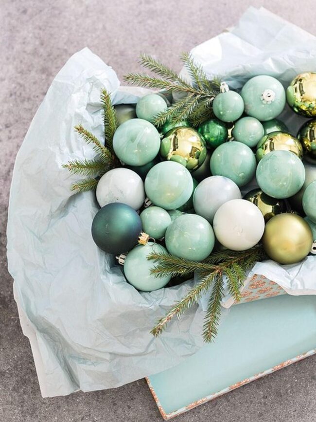Sparkling Christmas ornaments nestled in a pastel blue box catch your eye with their mesmerizing green, white, and gold surfaces that dance with light.