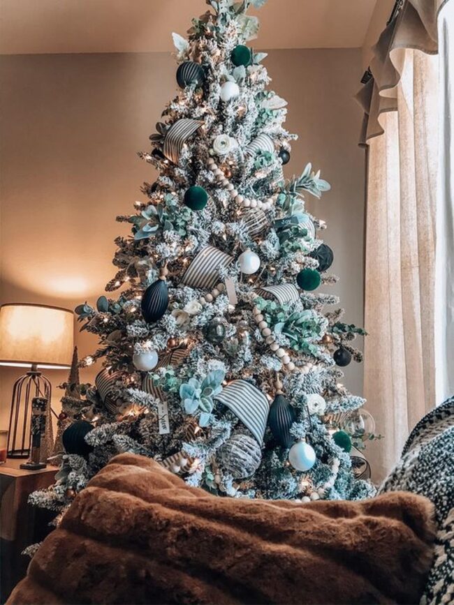 White-flocked Christmas trees become stunning focal points when surrounded by sleek surfaces and unexpected color combinations.